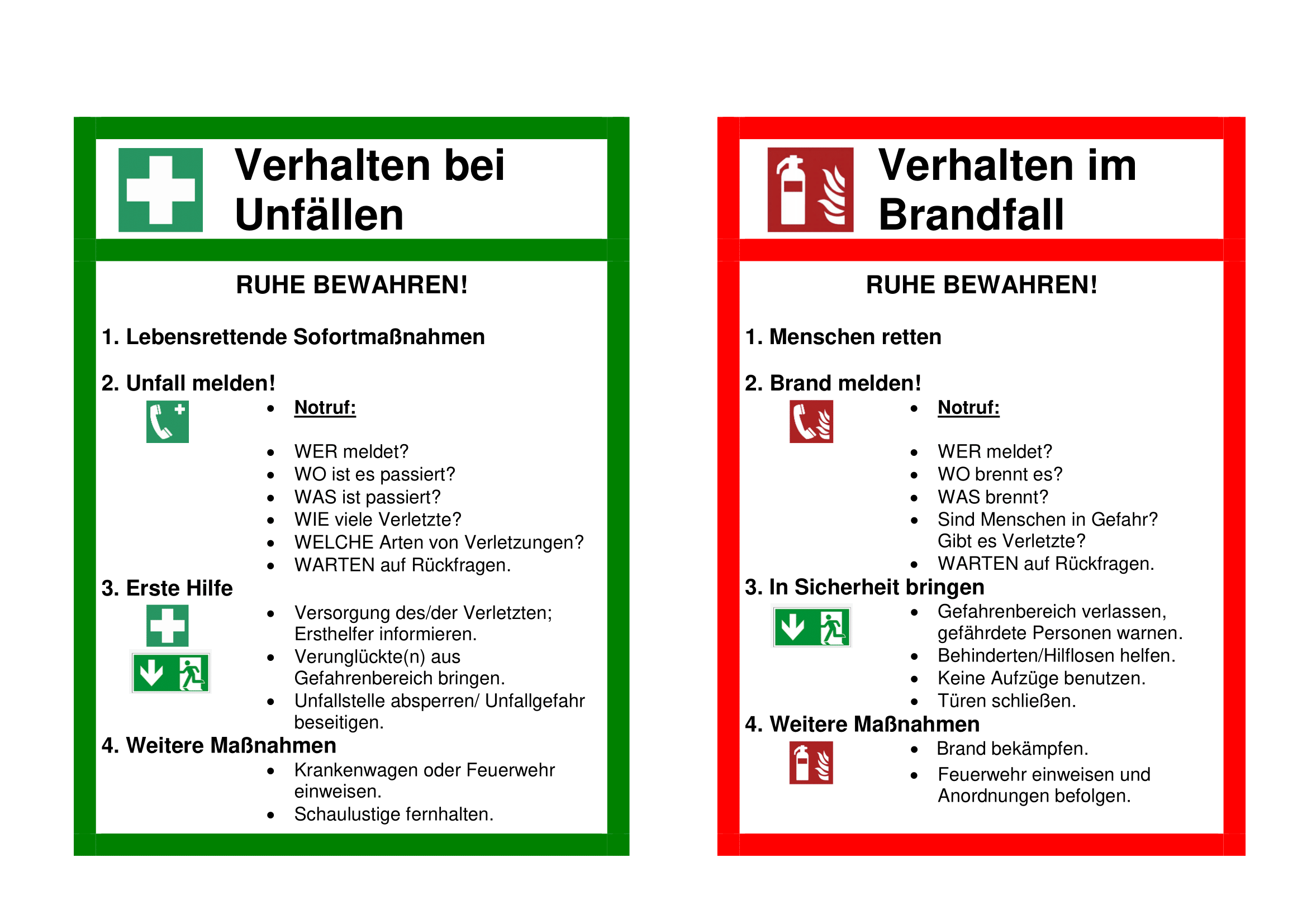 Ein ausgefüllter Aushang „Verhalten bei Unfällen“ befindet sich an allen zentralen Stellen des Gebäudes, so z. B. in Eingangsbereichen. Er teilt sich in drei Bereiche: